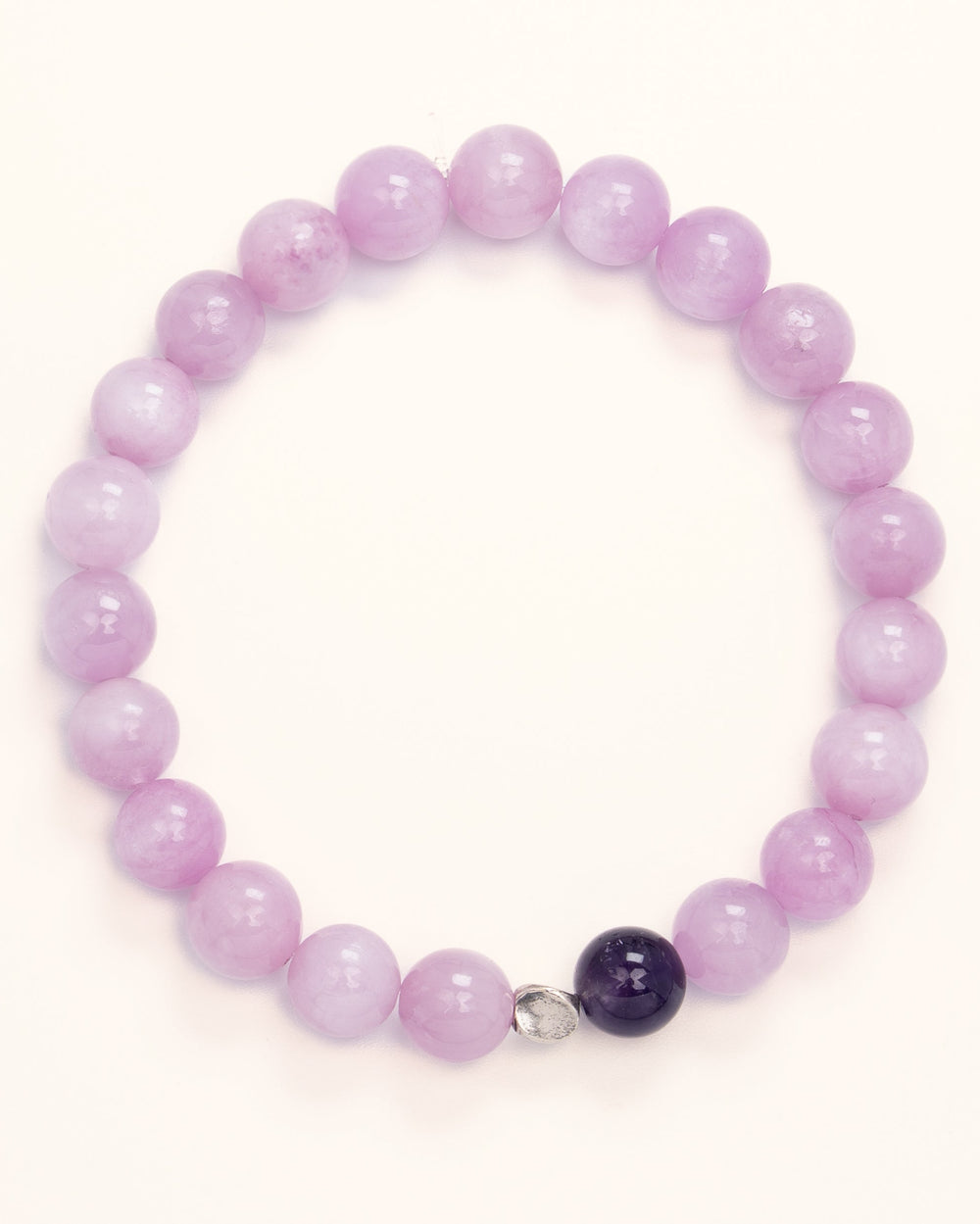 Energetic Properties: This bracelet creates a powerful, loving current of energy flowing directly from the Heart to the Crown Chakra. Kunzite, rich in lithium, is one of the most powerful stones for clearing emotional debris from the past. It gently opens the Heart Chakra, dissolving walls of fear and pain, and allows the wearer to experience pure, unconditional love. The single focal point of deep Amethyst connects this loving energy to the Crown Chakra. It provides spiritual protection, wisdom, and tranquility, ensuring that the heart's newfound openness is guided by divine insight, creating a state of serene, heart-centered consciousness.